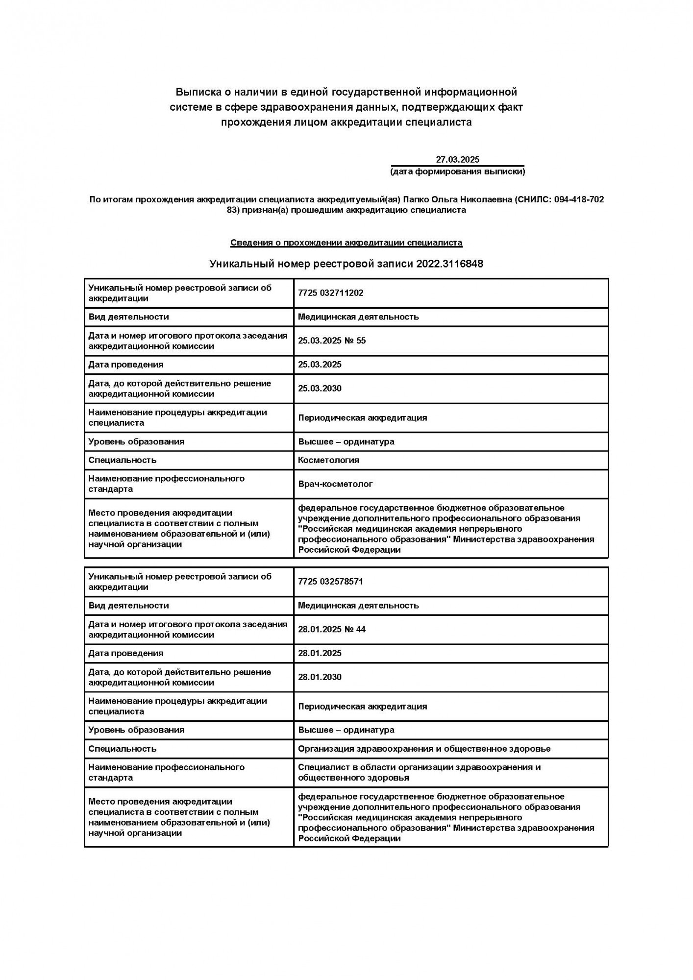 Аккредитация № 7725 032578571 пройдена 28.01.2025 (Главный врач) Аккредитация № 7725 032711202 пройдена 25.03.2025 (Врач-косметолог)